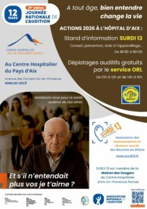 La Journée Nationale de l’Audition (JNA) est une campagne d’information, de sensibilisation et de prévention en lien avec la santé auditive. A l’occasion de sa 29ème édition, le jeudi 12 mars 2026, l’Association SURDI 13, Association des malentendants et devenus sourds des Bouches-du-Rhône, sera présente dans le Hall de l’Hôpital d’Aix-en-Provence, de 9h30 à16h30.