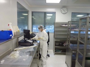 Deux ASH sont chargées du bionettoyage quotidien des locaux de la salle blanche avant le début et en fin de production (salle blanche, sas personnels, sas matériels…) soit une surface totale de plus de 100m². Un coursier dédié assure le matin la livraison et la dispensation aux soignants des préparations de chimiothérapie.